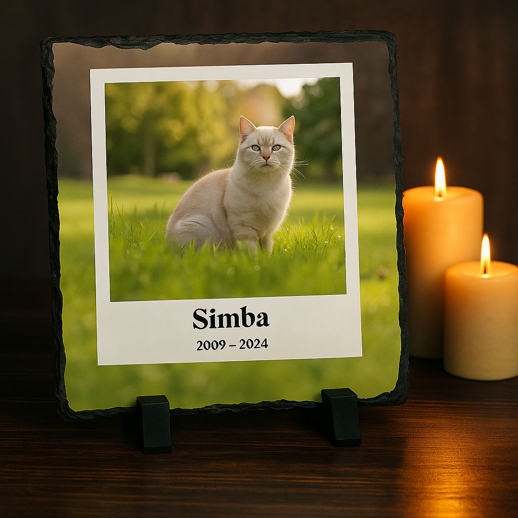 Bewaar de mooiste herinneringen aan je huisdier of een dierbaar persoon op een unieke manier met dit prachtige herinnering tegeltje van natuurlijke leisteen. Het tegeltje wordt bedrukt met een eigen foto en eventueel een naam, datum of persoonlijke tekst, zodat je een blijvende en tastbare herinnering hebt aan degene die je zo dierbaar is.